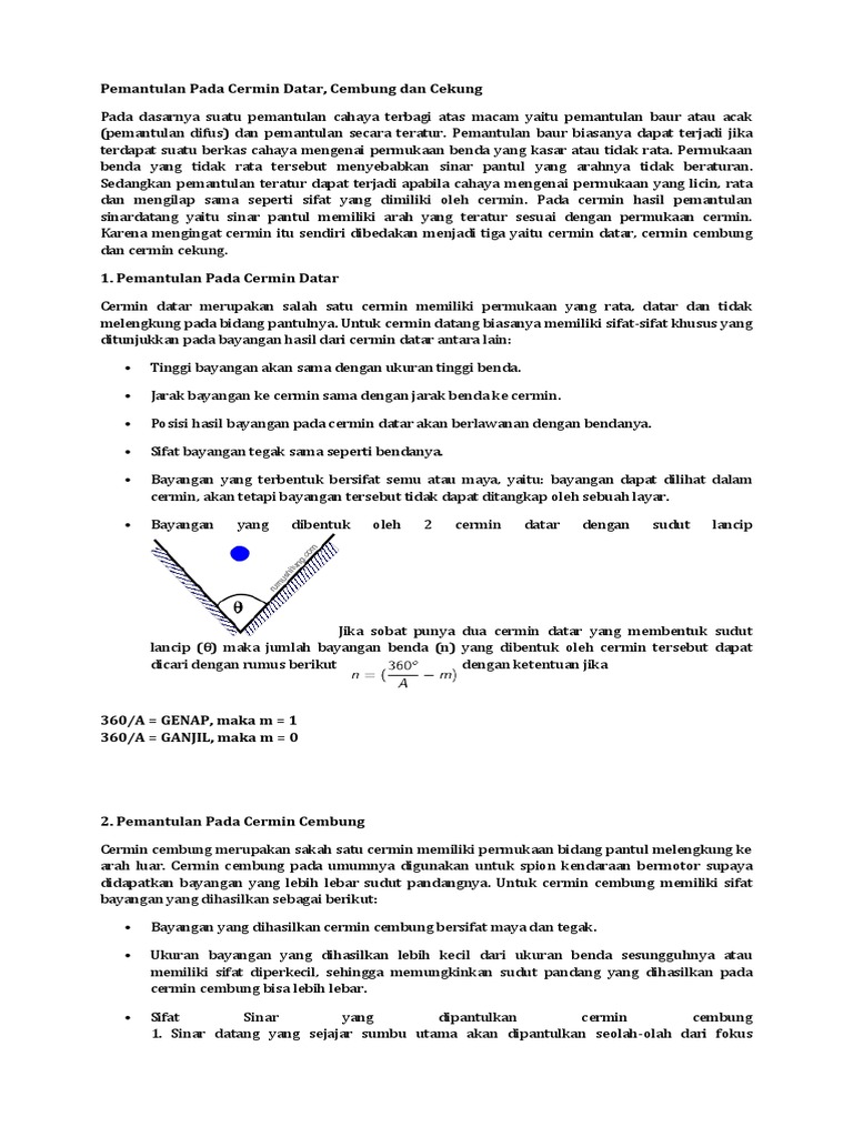 Cermin adalah sebuah benda dapat memantulkan bayangan dengan sempurna. Berbeda dengan cembung, cermin cekung dapat memantulkan cahaya sejajar pada titik fokus seperti cermin datar. Sifat bayangan cermin cembung adalah maya, tegak diperkecil. Cermin datar membentuk bayangan yang bersifat maya, tegak, dan sama besar dengan bendanya. Cermin cembung (konveks) biasa disebut cermin negatif karena bersifat menyebarkan sinar cahaya. Cermin pada umumnya dapat dibagi menjadi beberapa macam seperti cermin datar, cermin cekung dan cermin cembung. Cermin datar digunakan sebagai alat bantu pembiasan cahaya, periskop dan peralatan lainnya. Ketiga jenis cermin ini akan membentuk bayangan yang berbeda beda jika di depannya diletakkan benda yang sama. Cembung dan cermin datar no alat dan bahan fungsi 1. Cermin cekung bersifat mengumpulkan cahaya cermin cembung bersifat menyebarkan cahaya (divergen) dengan sifat bayangan maya, tegak, dan diperkecil. Cermin datar mempunyai sifat bayangan yang unik dan tentu saja berbeda dengan jenis cermin cekung ataupun cembung. Diharapkan anda dapat mengetahui perbedaan cermin datar, cermin cekung dan cermin cembung setelah anda nantinya memahami sifat banyangan yang dihasilkan pada ketiga cermin tersebut. Cermin cekung biasanya digunakan sebagai reflektor pada lampu mobil dan lampu senter.